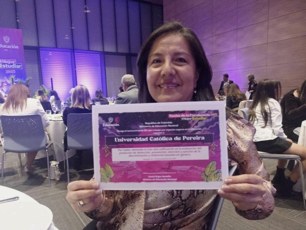 Noticias noviembre 25, 2025 Durante la noche de la excelencia 2025, la Universidad Católica de Pereira recibió el reconocimiento del Ministerio de Educación Nacional como una de las instituciones que trabaja por espacios seguros en el ámbito educativo. Esta exaltación se logra al obtener la más alta calificación en la evaluación del protocolo de detección, prevención, atención y sanción de la discriminación y violencias basadas en género. Para la Universidad es motivo de satisfacción recibir este reconocimiento ya que es el resultado de las estrategias y planes que se han venido implementando por medio de protocolos y rutas de atención que buscan mantener la sana convivencia en el campus y el respeto por la dignidad humana.