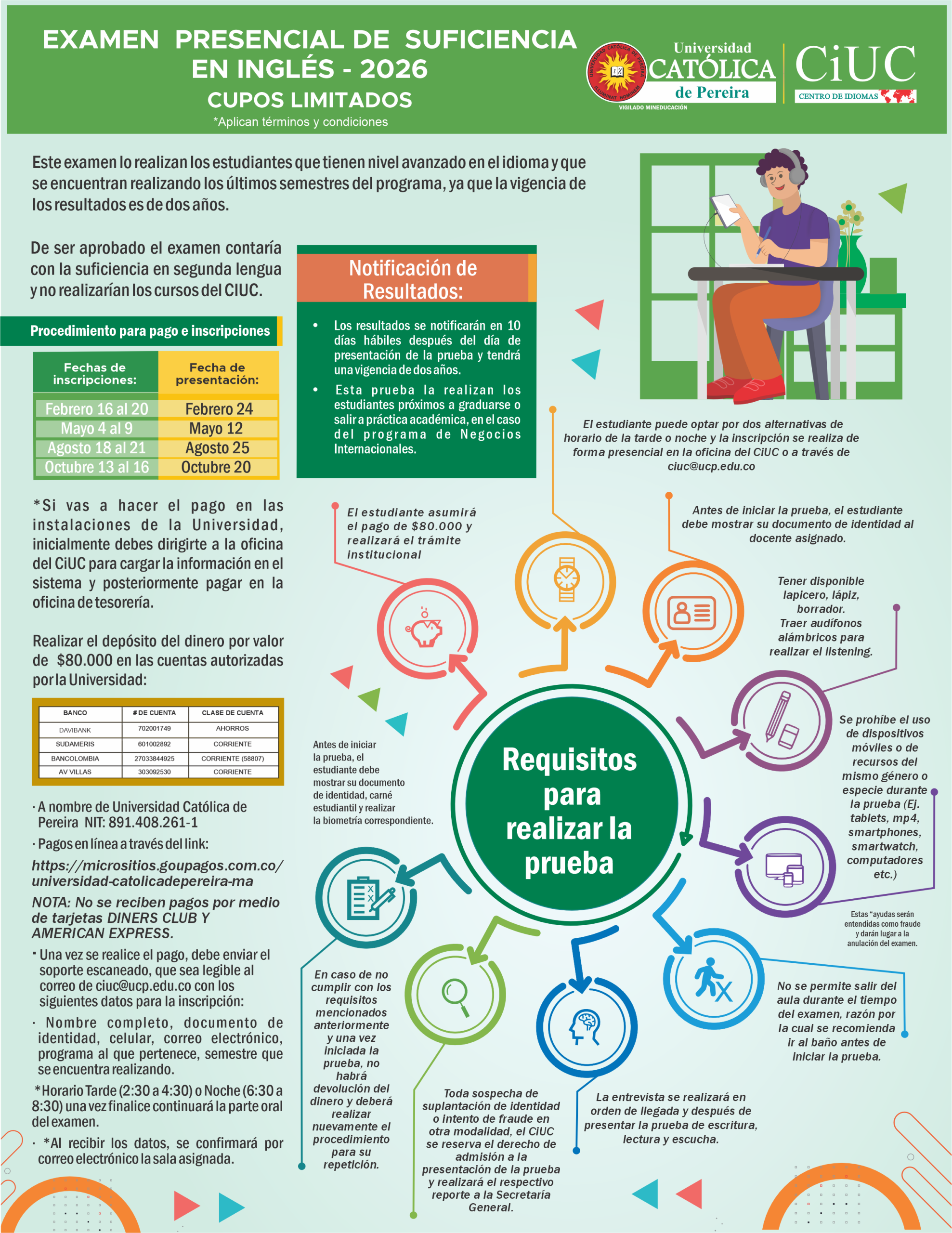 Una vez realice el pago debe enviar el soporte escaneado que sea legible al correo del ciuc@ucp.edu.co con los siguientes datos:
