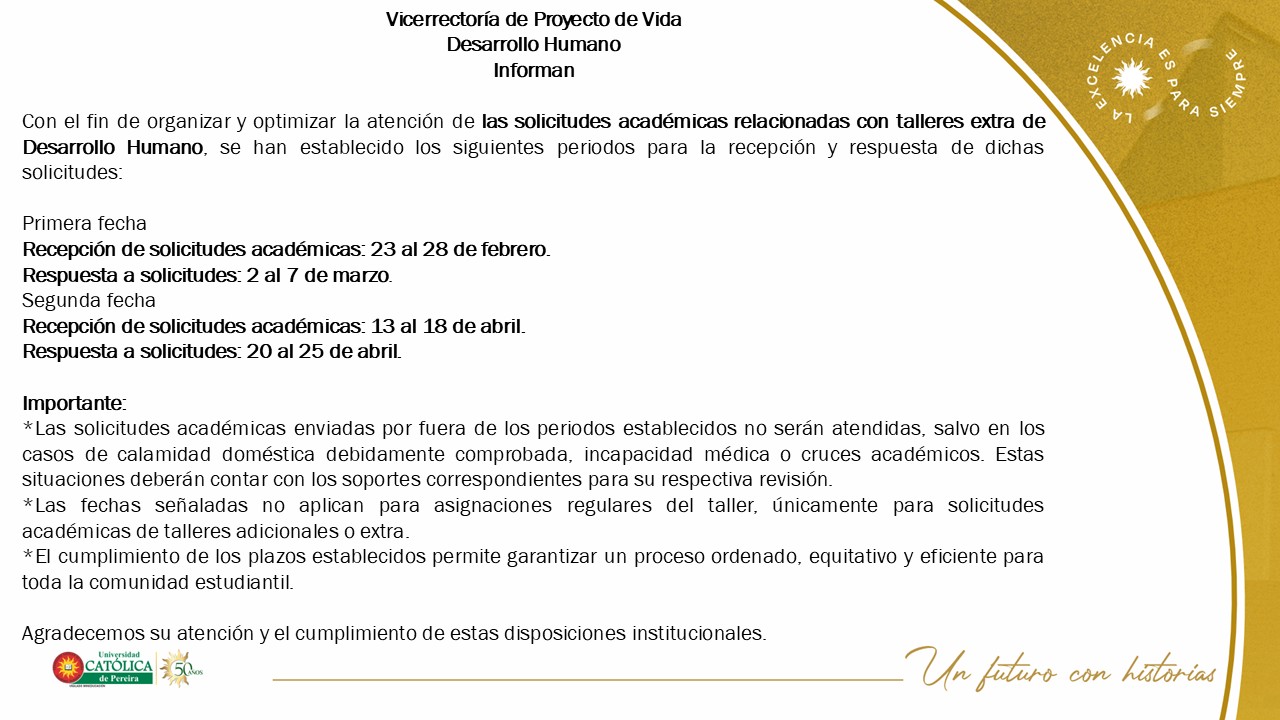 representantedocenteconsejosuperior@ucp.edu.co representantedocenteconsejoacademico@ucp.edu.co Moodle Evaluación a Talleres de Desarrollo Humano Reglamentos Preguntas frecuentes Inicio Portal del estudiante Solicitudes académicas Paso a paso para trámites de solicitudes académicas Solicitud de acompañamiento Canal de apoyo para acompañamiento integral durante tu vida universitaria. Talleres de desarrollo humano Guía para acceder a espacios formativos de crecimiento personal y bienestar. Activación ruta de inclusión Solicitud de acompañamiento para grupos poblacionales priorizados. Portal del Estudiante Acceder ¿Solicitud de certificados académicos? ¿Solicitud de certificados académicos? ¿Cómo consultar horarios de clase? Cómo realizar matrícula académica a través de internet
